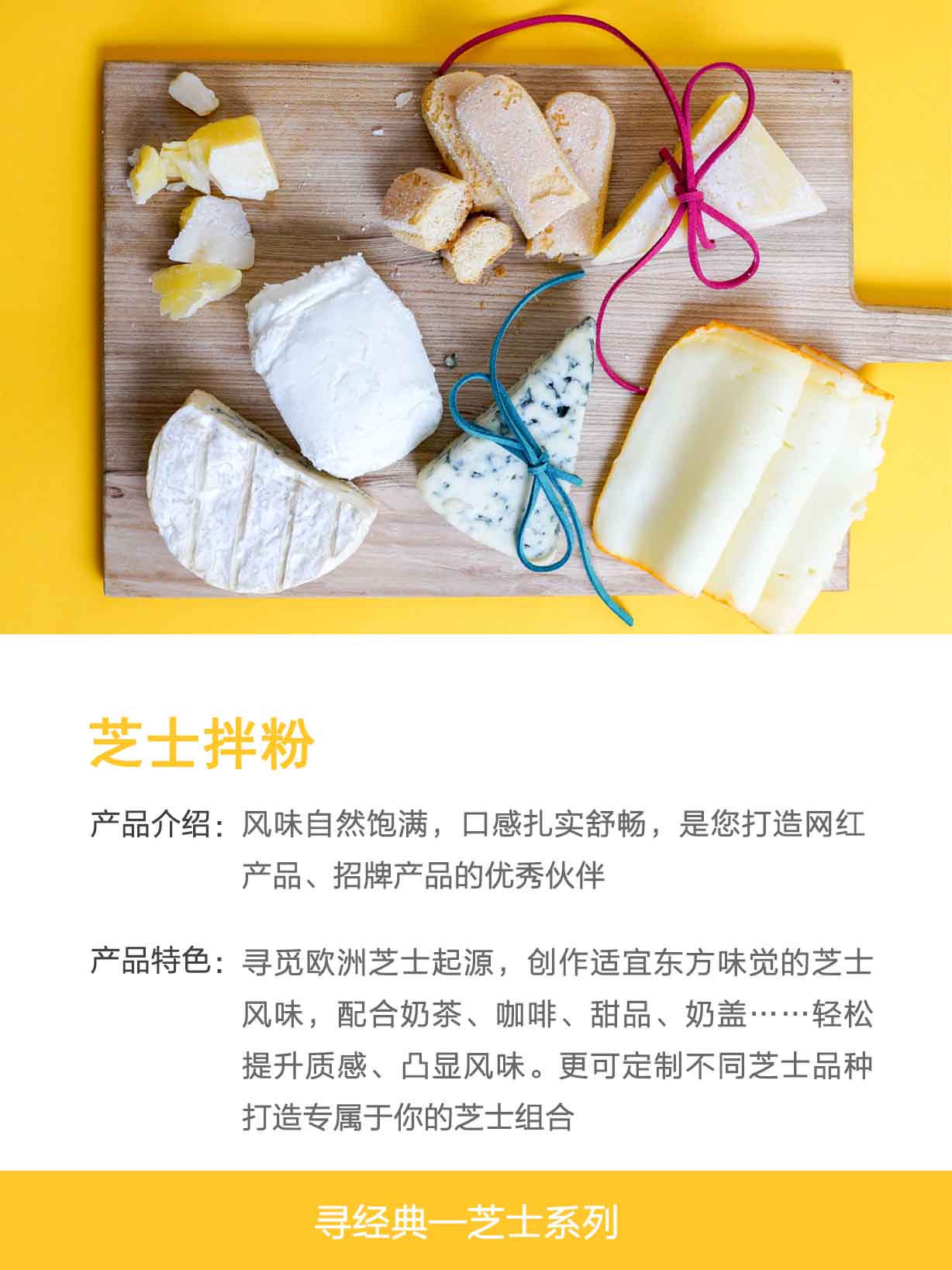 尋覓歐洲芝士起源,創(chuàng)作適宜東方味覺(jué)的芝士風(fēng)味,可搭配奶茶、咖啡、甜品、奶蓋…